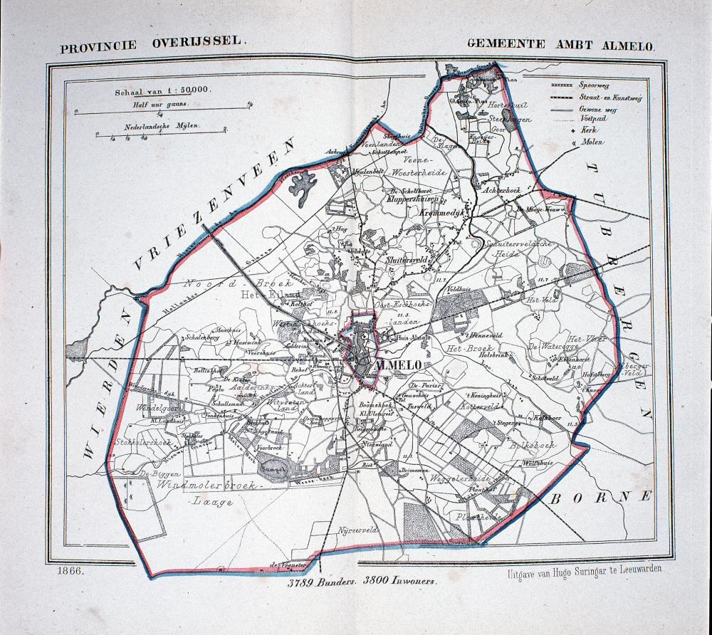 SAB nummer:1010 D 6. 3789 Bunders, 3800 Inwoners. Scale on map is in half hour distance and in Dutch miles. Right-top has legend for railroad and roads, as wel as mills and churches.