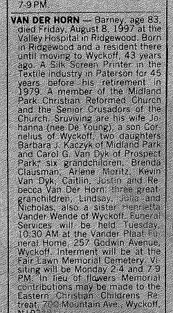 Obit Barney Van der Horn. Bergen Record, 10 Aug. 1997, pg. NJ6, col. 5