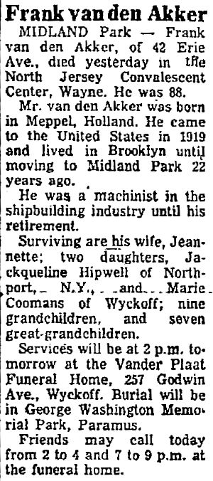 Obit Fran van den Akker. Bergen Evening Record, Mar. 9, 1975, pg. D29