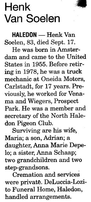 Obit Henk Van Soelen. Shoppers News, Sep. 25, 2002