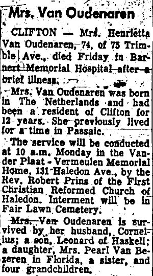 Obit Mrs. Van Oudenaren. Paterson Evening News, Feb. 19, 1972, pg. 35