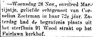 Obit Martijntje Zoeteman. Het Oosten, Dec. 7, 1917, pg. 6 (Translation: Martijntje, beloved wife of Cornelius Zoeteman, died Wednesday 28 November at age 72. She was buried Saturday from her residence on 91 Wood, in Fairlawn Cemetery)