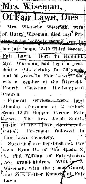 Obit Mrs. Wiseman. Fair Lawn Paramus Clarion, July 14, 1944, pg. 3