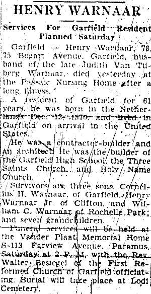 Obit Henry Warnaar. Bergen Evening Record, July 28, 1949