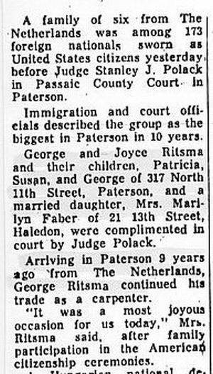 Naturalisation Ritsma Family. Paterson Morning Call, June 18, 1966, pg. 17