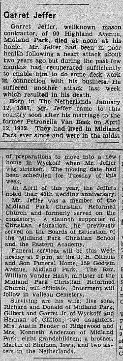 Obit Garret Jeffer. Ridgewood Herald News, 27 Nov 1952, pg. 6, col. 2-3