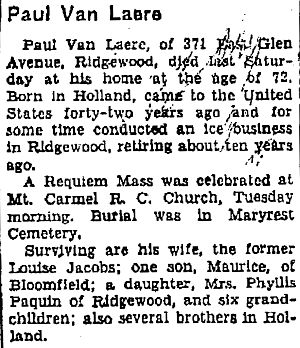 Obit Paul Van Laere. Ridgewood Herald News, Mar. 5, 1953, pg. 6