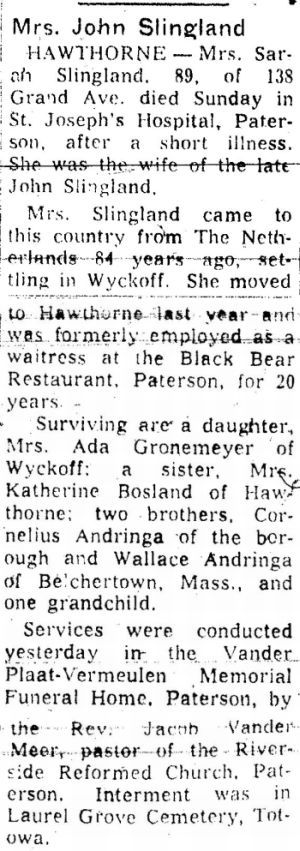 Obit Mrs. John Slingland. Ridgewood Herald News, 15 July 1971, pg. B4