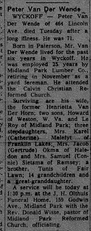 Obit Peter van de Wende. Ridgewood Herald News, 29 Jul 1971, pg. B15