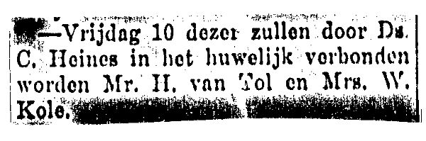 Wedding H. Van Tol and Mrs. W. Kole. Het Oosten, July 3rd, 1914, pg. 29
