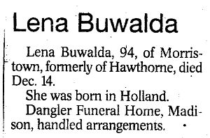 Obit Lena Buwalda. Shoppers News, Dec 22, 2004, pg. 32