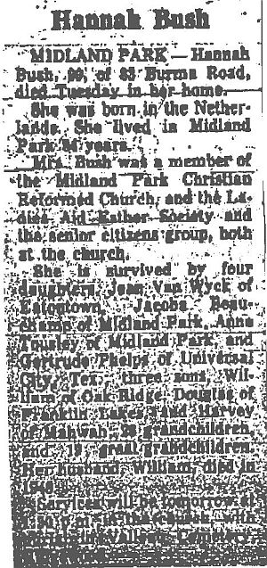 Obit Hannah Bush. Bergen Evening Record, Jan 23, 1975