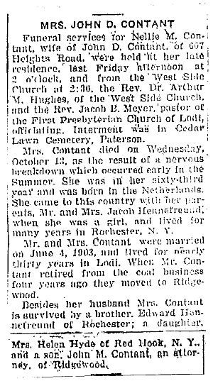 Obit Mrs. John D. Contant. Ridgewood Herald Oct 21, 1937