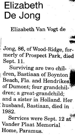 Obit Elizabeth De Jong. Shoppers News, Sep 17, 2003, pg. 44