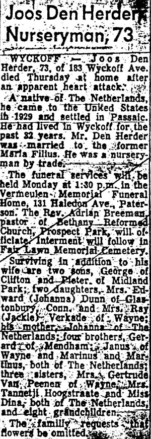 Obit Joos Den Herder. Paterson Evening News Apr. 15, 1966, pg. 23