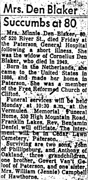 Obit Mrs. Den Blaker. Paterson Evening News Apr. 23, 1966, pg. 27