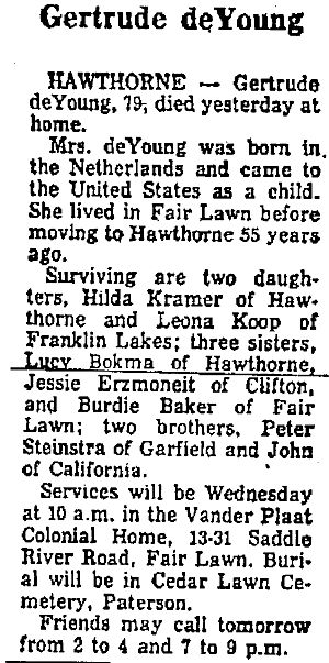 Obit Gertrude deYoung. Bergen Evening Record, Mar 24, 1975