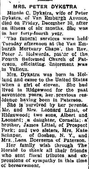 Obit Mrs. Peter Dykstra. Ridgewood Herald, Jan 5, 1939, pg. 2