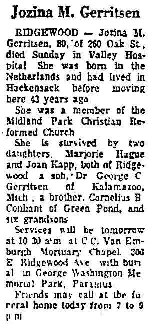 Obit Jozina M. Gerritsen. Bergen Evening Record, Jan 2, 1974