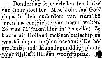 Obit Mrs. Johanna Gorriepa, Het Oosten, Jul 3, 1914, pg. 25 (Translation: Johanna Gorriepa died Thursday at the home of her daughter at the age of 88, after an illness of 9 weeks. She was 71 yrs in the US. She came from Holland with a sailing ship, the trip lasted 95 days. The funeral was on Monday with Ds. Hill officiating)