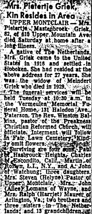 Obit Mrs. Pietertje Griek. Paterson Evening News, Apr 11, 1966, pg. 35
