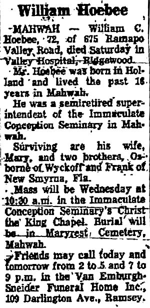 Obit William Hoebee. Bergen Evening Record, May 19, 1975