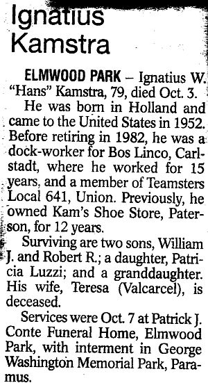 Obit Ignatius Kamstra. Shoppers News, Oct 12, 2005, pg. F46