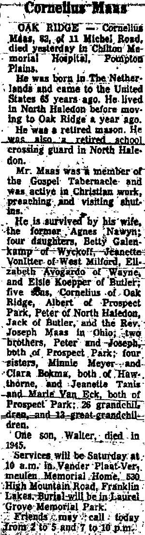 Obit Cornelius Maas. Bergen Evening Record, Jan. 10, 1975