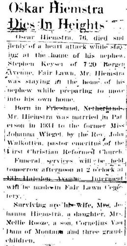 Obituary Oskar Hiemstra. The Fair Laws-Paramus Clarion, July 14, 1944, pg. 1