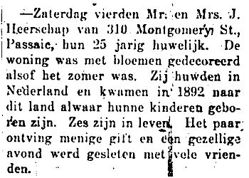 Anniversary Mr. and Mrs. J. Heerschap, Het Oosten, Dec 7, 1917, pg. 6 (Translation: On Saturday Mr. and Mrs. J. Heerschap of 310 Montgomery Street, Passaic, celebrated their 25th wedding anniversary. Their home was decorated with flowers as if it were summer. They were married in Holland and came in 1892 to this country, where there children were born. Six are still living. The couple received many gifts, and they passed a companionable evening with many friends)