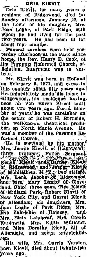 Obit Orie Kievit. Ridgewood Herald, Jan. 25, 1939, pg. 2