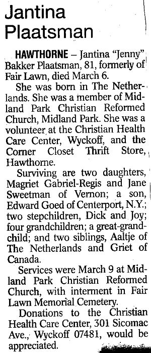 Obit Jantina Plaatsman. Shoppers News, March 16, 2005, pg. 40