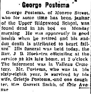 Obit George Postema. Ridgewood Herald, Jan. 3, 1918