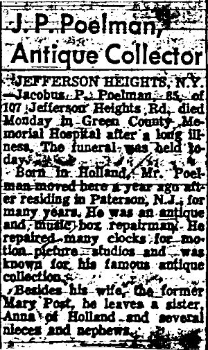 Obit J. P. Poelman. Paterson Evening News, Feb. 17, 1972, pg. 41