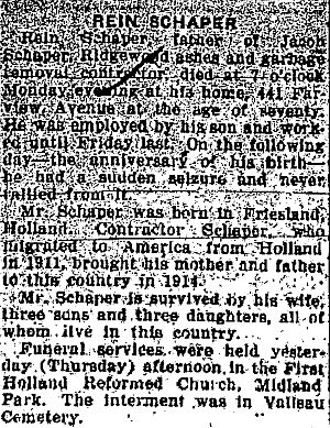 Obit Rein Schaper. Ridgewood Herald, May 18, 1934