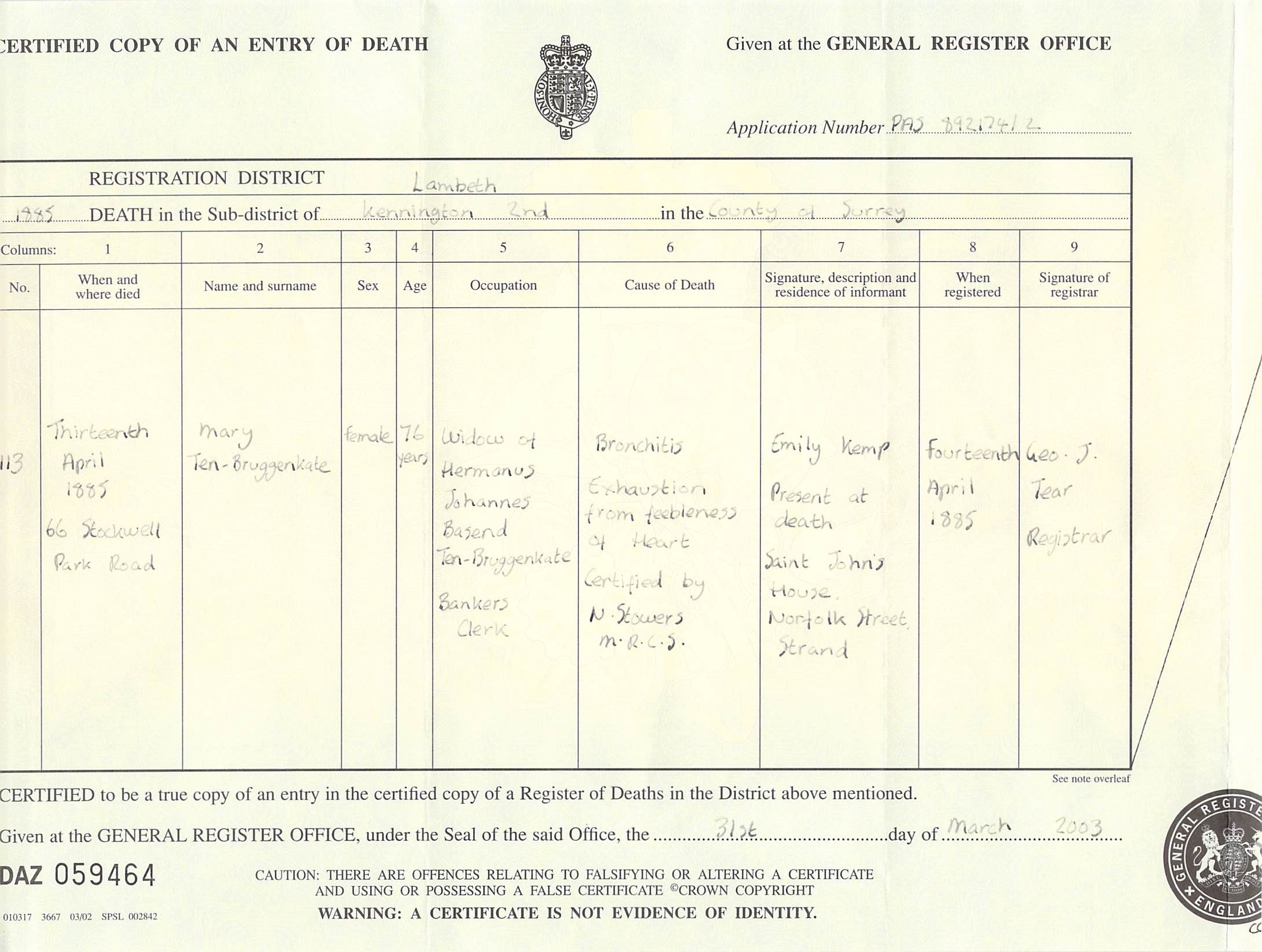 Lambeth, Jun 1885, Volume 1d, pg 261, #113. Mary Ten-Bruggenkate, 13 Apr 1885