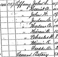 . Gezin bestaat uit John Sheldon, zijn vrouw Harriet en hun kinderen John W., Judson E., Thaddeus E., Hiram B., Charles H., Minnie E. en Fred A.9 1880 Fed. census (1 Jun): Gezin van John Sheldon Tiffany, ED 3, Mount Pleasant Township, Wayne County, Pennsylvania