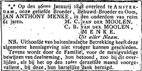 - [S3] Overlijden Jan Anthony Menke, 26 Jan 1848. Familieberichten op Microfiche.