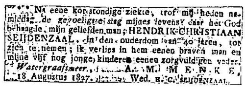 - [S3] Overlijden Hendrik Christiaan Seijdenzaal, 18 Aug 1827. Familieberichten op Microfiche.