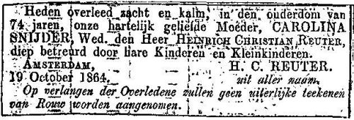- [S3] Overlijden Carolina Snijder, 19 Oct 1864. Familieberichten op Microfiche.
