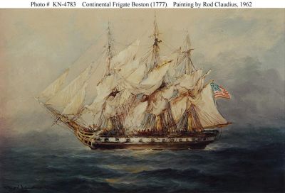 Boston, a 514-ton 24-gun frigate, was built at Newburyport, Massachusetts, as part of the effort by the American colonies to create a seagoing navy. Completed in 1777, in May of that year she began a North Atlantic cruise in company with the frigate Hancock. In addition to making prizes of two merchant vessels, they captured the British 28-gun frigate Fox on 7 June. A month later, Boston was able to escape when Hancock and Fox were taken by a stronger enemy squadron. In February and March 1778 she transported American envoy John Adams to France, then remained in European waters raiding British commerce. She returned to the Colonies in October. The following year Boston operated in the North Atlantic, taking several prizes during cruises in July-September and November-December. In 1780 she took part in the defense of Charleston, South Carolina, and was captured there by the British 12 May. Renamed Charleston, she served in the Royal Navy until March 1783, when she was sold for breaking up.4 |