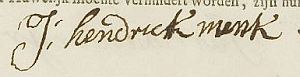 Hendrik Menke was born in 1719 in Boer (prob. Buer), Germany.1 He married Catharina Elizabeth Zimmerman1,2 (banns 7 May 1744, Amsterdam. His witness was Jan Jochem Stapelveld; hers her uncle Maurus Uijlenbroek.)1 He died in Sep 1783 in Amsterdam (Blomgracht NZ)3, and was buried on 18 Sep 1783 in the Old Lutheran Cemetery at Amsterdam.3