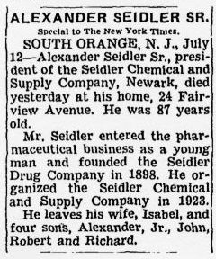 Alexander Seidler was a druggist8,9He was the founder and director of the Alexander Seidler Co. or Seidler Drug Co. in 1898, and the Seidler Chemical and Supply Co. in 1923. The firm is located in Newark, New Jersey. His son Richard and his grandson Richard, Jr. continued the company after him.10,5,6,11