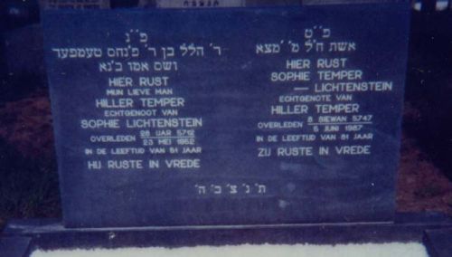 Sophie Lichtenstein was born on 10 May 1906 in Jülich.1 She (1) married Max Baum on 1 Feb 1935 at Jülich.2,3 She (2) married Hiller Temper on 1 Jun 1949 at Amsterdam.2,4,3 She died on 5 Jun 1987 in Laren1,3, and was buried on 7 Jun 1987 in the Jewish Cemetery at Muiderberg E, 43, 39.3,4 An death notice mentions her executor.3